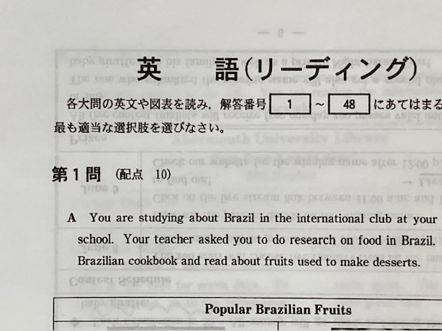 英語(リーディング)は最初から最後まで長文読解問題となっている。TOEICで言うと、すべてがPART7みたいな問題になっていて、TOEICのような複数の文書の問題もある。設問で問われるのは読解力。