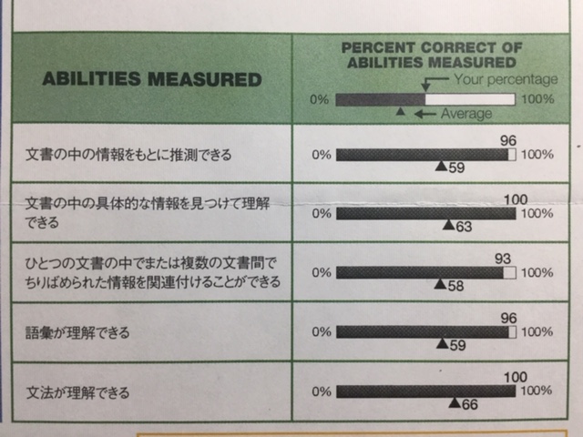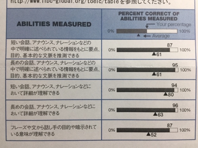 「短い会話、・・・、基本的な文脈を推測できる」の87%を見ると、難しいと思ったパート1で、やはりミスがあったんじゃないかと思われる。